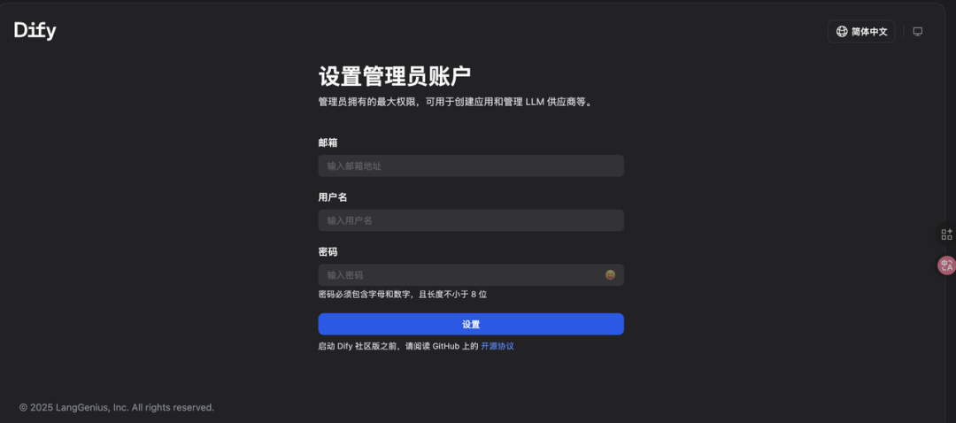 注意: 这是你整个 Dify 实例的“超级管理员”(root 用户),拥有最高权限。请务必使用一个安全的密码。