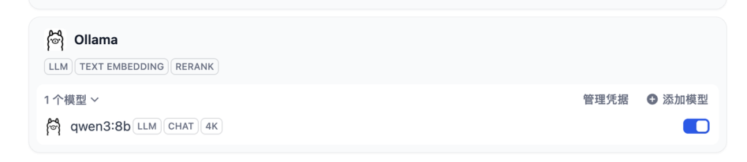 模型名称:qwen3:8b (必须与 ollama list 中的名字完全一致)