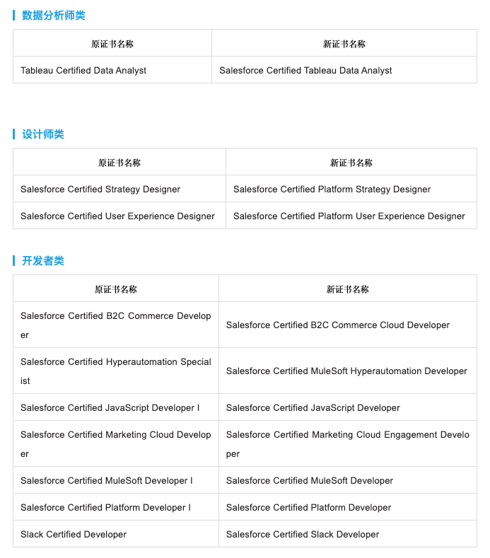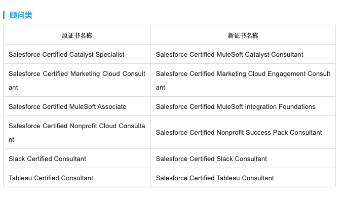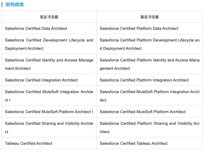 注意:像 Platform App Builder、B2C Solution Architect、System Architect、Service Cloud Consultant、AI Associate 等证书,本次未作更名,目前依然保留原始名称。