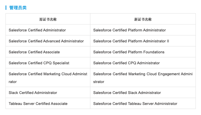 例如,“Salesforce Certified Administrator” 更名为 “Salesforce Certified Platform Administrator”,突出平台管理定位,同时统一前缀。