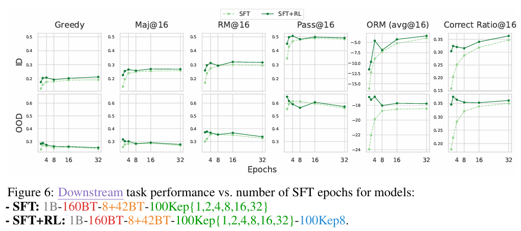 SFT 轮数超过 4 轮后,域内(In-Domain)表现虽持续上升,但域外(Out-of-Domain)泛化能力会急剧下降。- 操作建议: 严控 SFT 在 2-4 个 Epoch 之间,为后续 RL 留出策略空间。