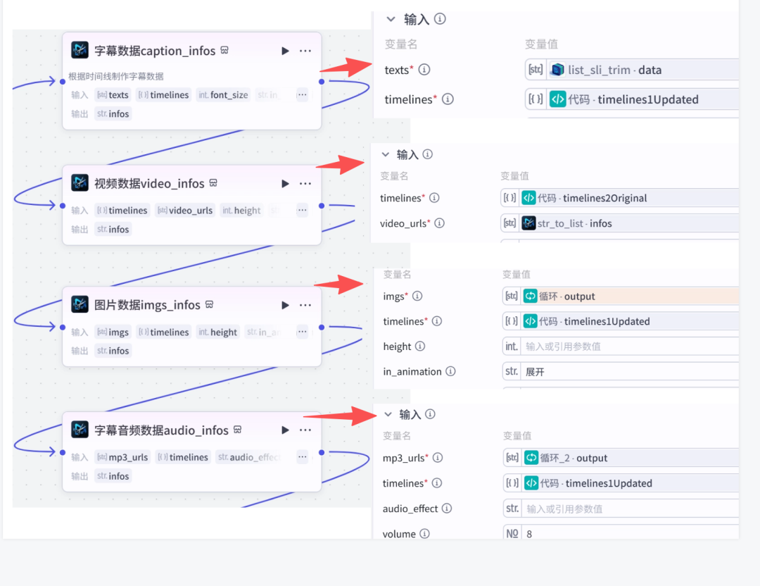 3)代码节点根据前面2个时间线,进行数据整合,把其他素材比如正文图片,音频,背景音乐等时间线计算出来。这部分代码可以文末向我领取,直接复制使用,这里不再介绍。