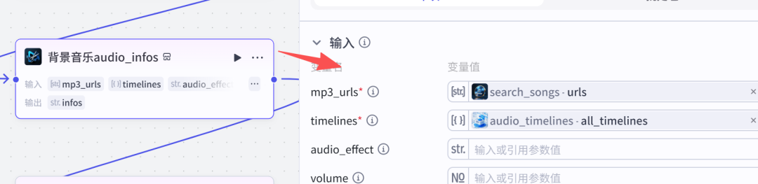 使用【剪映小助手】插件的audio_infos方法,根据上面返回的urls和音频时间线生成背景音乐数据。