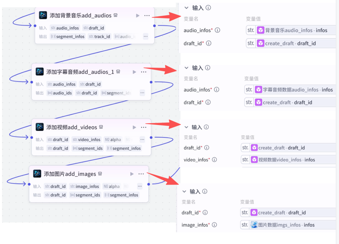 这里的audio_info 就是上面节点audio_info方法的返回,比如添加背景音乐add_audios 它的参数audio_infos选背景音乐audio_infos的结果,其余类似,大家理解后,就发现都是有规律的,不难理解了。