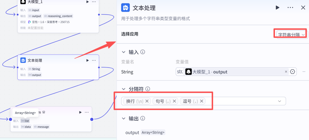 使用【文本处理】节点对文案进行分割,分隔符设置如下: