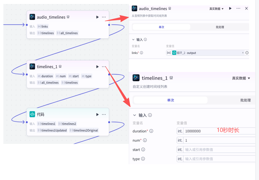 1)使用【剪映小助手】的audio_timelines方法,根据循环节点返回的语音音频列表生成音频时间线。