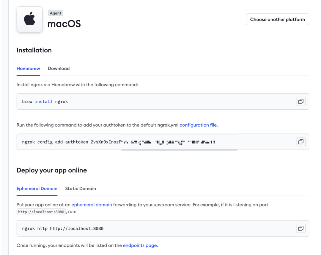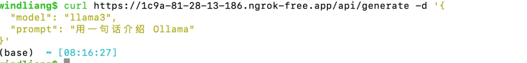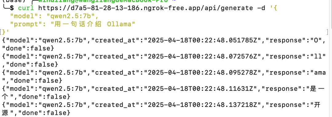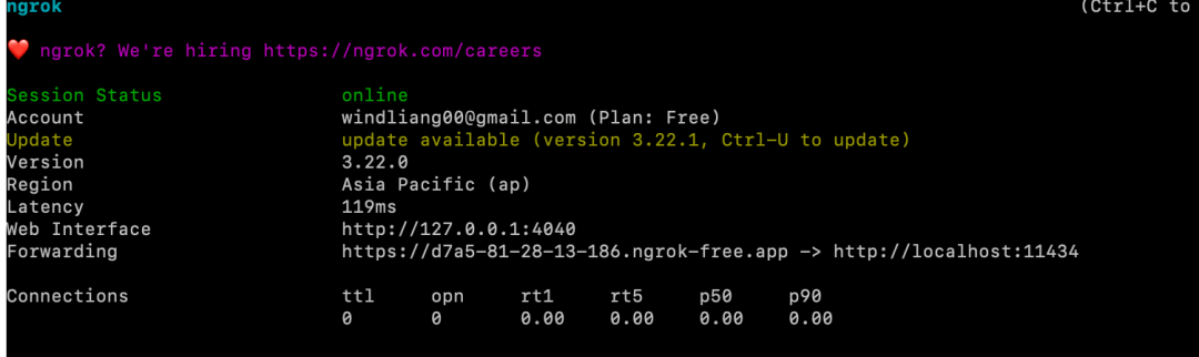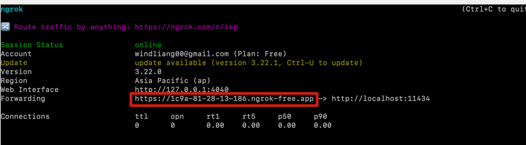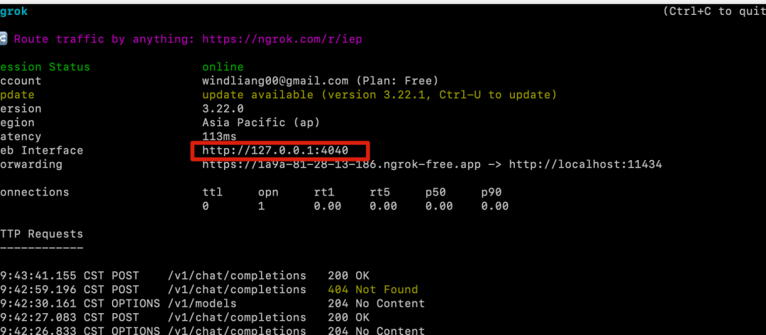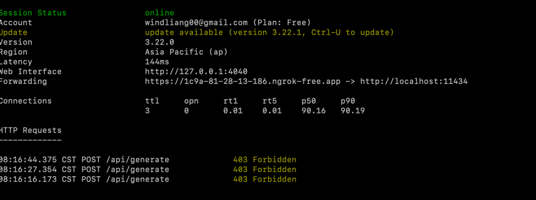 安装之后,先执行上边的 ngrok config add-authtoken xxxxxxxxxxxxxx ,接着执行 ngrok http http://localhost:11434 就把本地 ollama 的 HTTP 接口暴露到公网了: