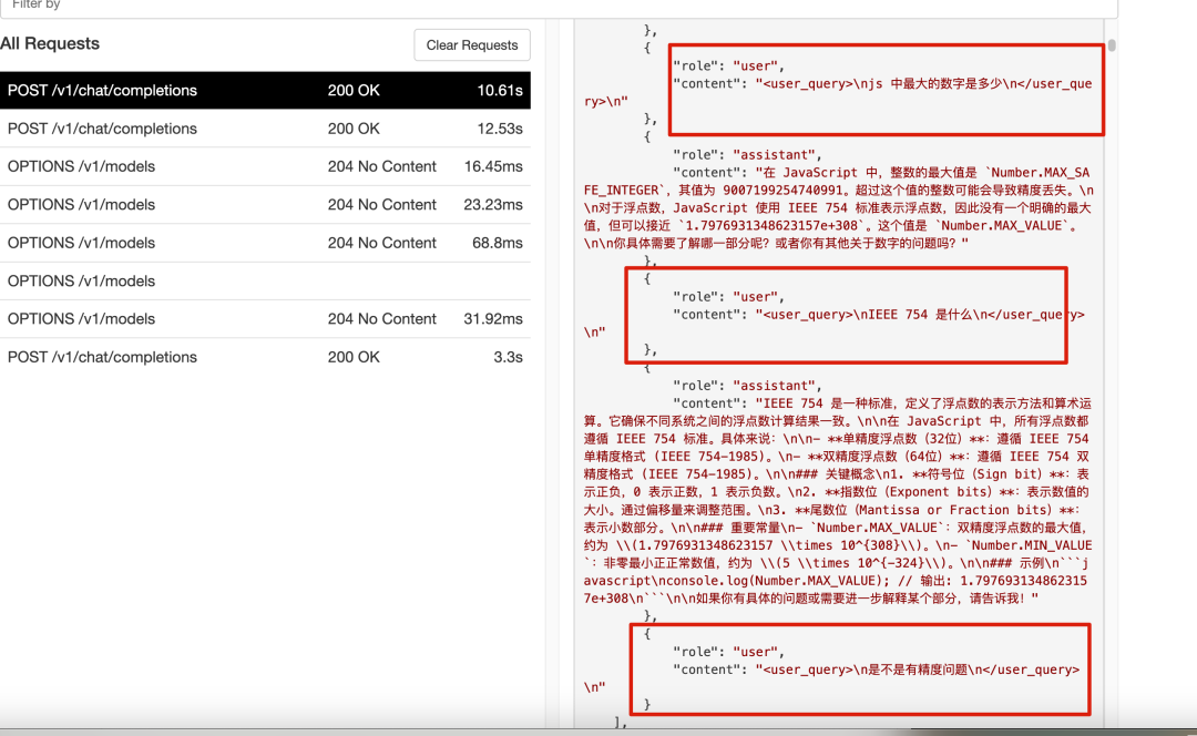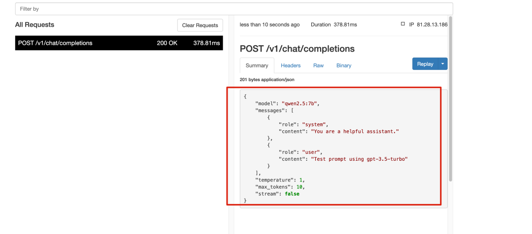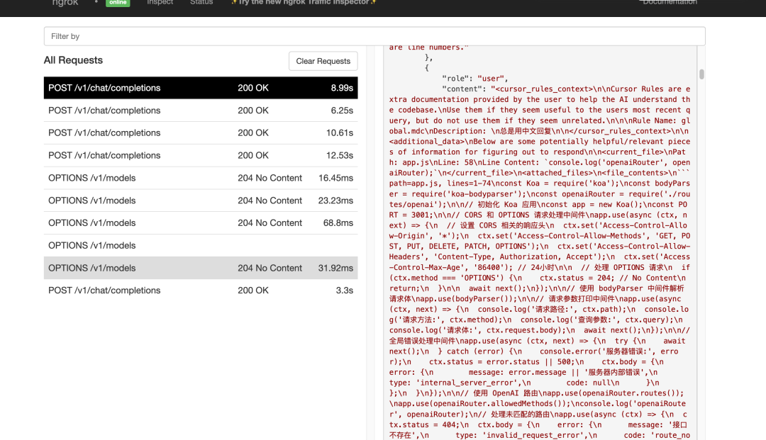 会看到刚才点击 Verify,其实 Cursor 向我们本地大模型发送了一次请求: