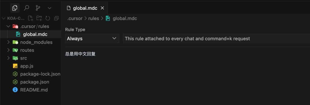 新建 .cursor/rules/global.mdc ,测试 rules