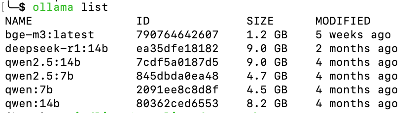 ollama list 可以查看已经安装的所有大模型: