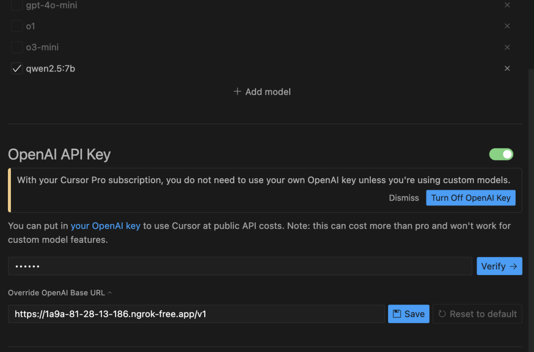 打开 Cursor 的设置,先把其他的 model 都反选掉,再加一个 qwen2.5:7b 的 model,下边的 api 地址填写 ngrok 生成的域名加 /v1,API Key 随便写。