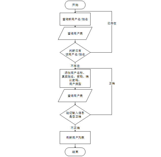 添加新用户的流程是先查询新用户名是否已存在,如已有该用户名,需重拟用户名并同时输入新用户的其它信息,添加新用户到数据库时会先验证数据是否完整,信息都正确且完整时,返回并刷新用户列表;信息不正确时,会返回输入信息的那一步。该流程如图3-4所示。