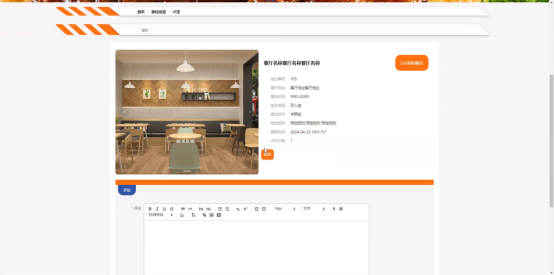 餐位信息:在餐位信息页面的输入栏中输入餐厅名称进行搜索,可以查看到餐位详细信息,并进行预定、评论或收藏操作;餐位信息页面如图5-4所示: