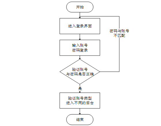 登录流程是该系统的第一个流程,登录的第一步是输入账号、密码登录,系统会验证账号与密码是否正确,正确时系统会判断账号类型再进入不同的后台;不正确时,会返回到登录的第一步,输入用户重新执行登录流程。该流程如图3-3所示。