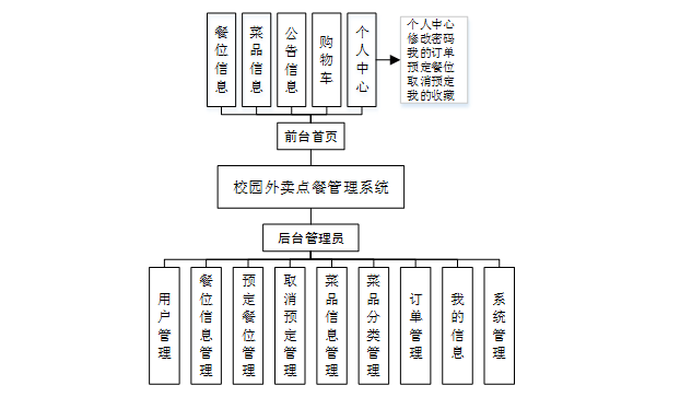 本系统使用的数据库为MySQL数据库,选择该数据库的原因是因为该数据库开源、免费,且相对简便,且由于使用人数众多,在处理问题上会得到更多已知的帮助。本系统作为一个校园外卖点餐管理系统,其体量并不会很大,也很适合MySQL数据库的特点。综上所述,本项目采用MySQL作为本项目的数据库和进行数据表的设计。如图4-1是该系统软件的总体功能结构图: