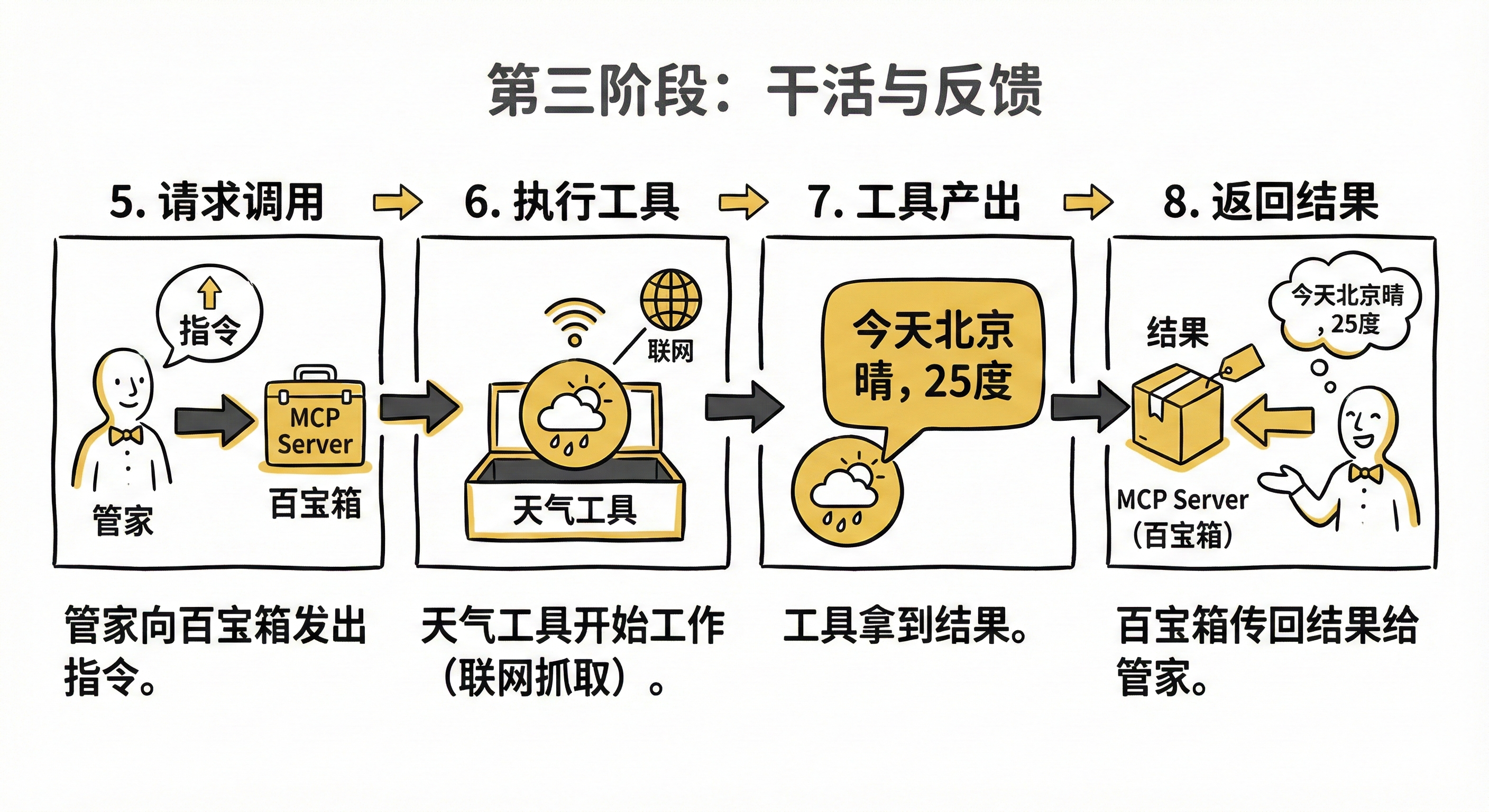 - Request tool call (请求调用): 获得批准后,管家向存放工具的百宝箱(MCP Server)发出指令。