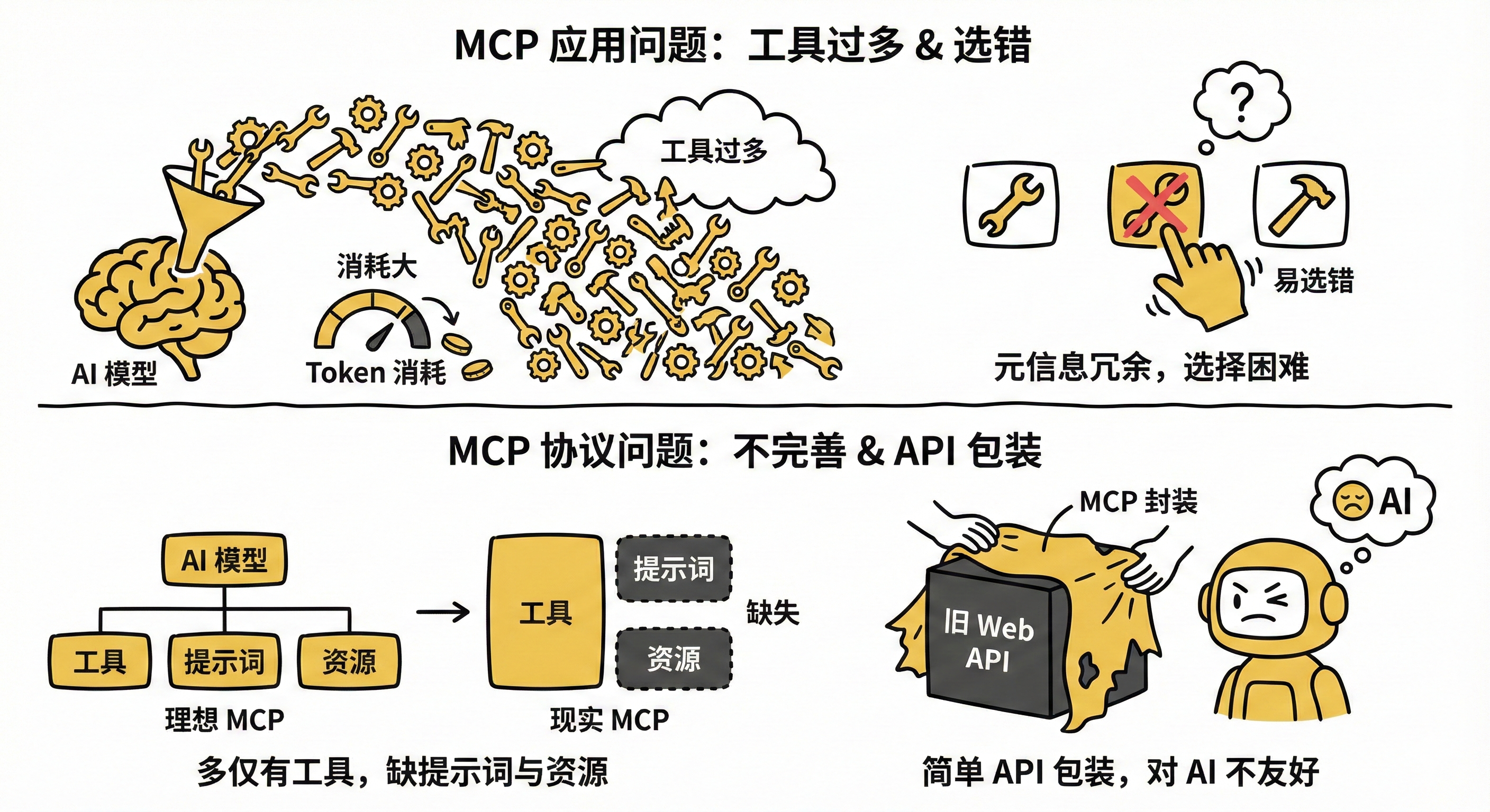 而且现在很多人封装 MCP 服务的时候,只是把之前面向 Web 的 API 包装成了MCP协议给模型的调用,对 AI 并不是很友好。