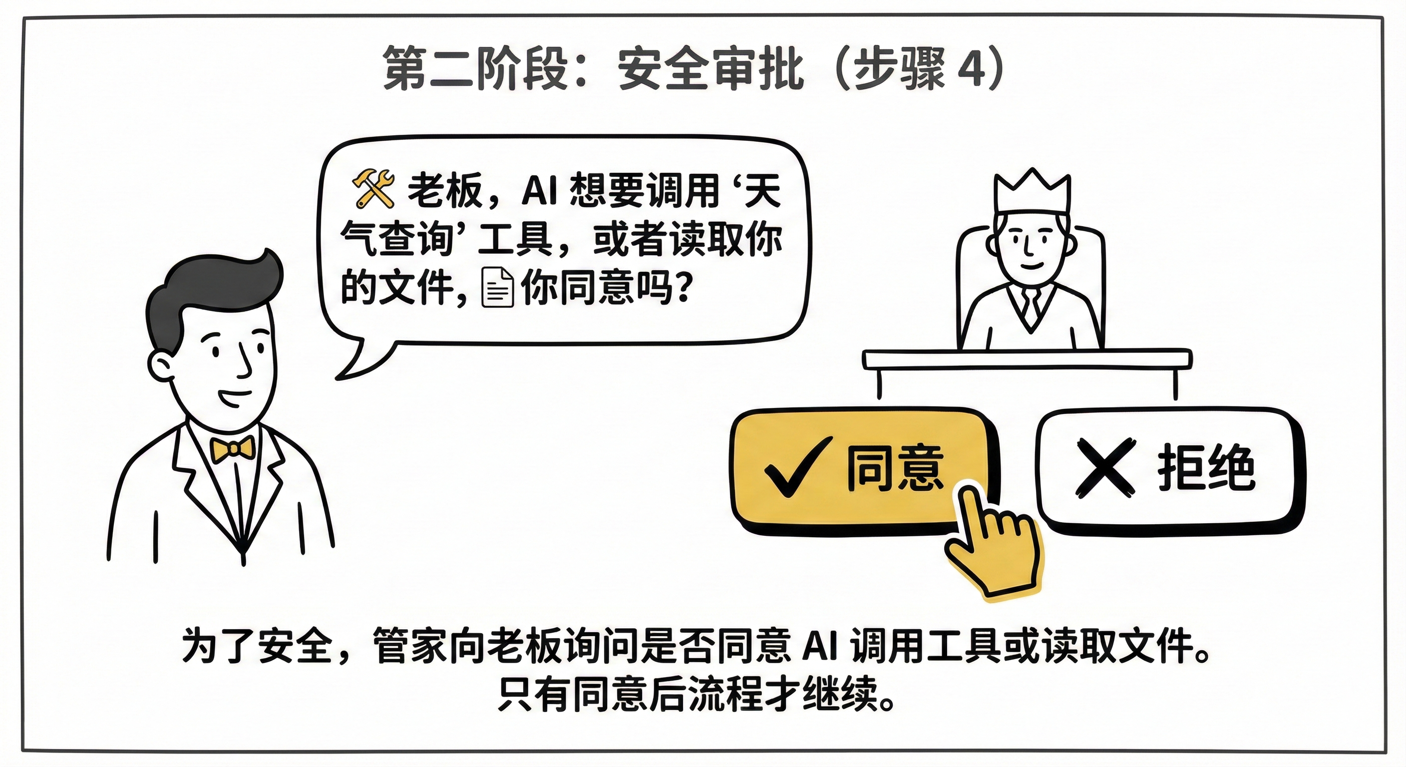 - MCP Tool approval (工具审批): 这一步很关键! 为了安全,管家会转头问你:“老板,AI 想要调用‘天气查询’工具,或者读取你的文件,你同意吗?”只有你点了“同意”,流程才会继续。