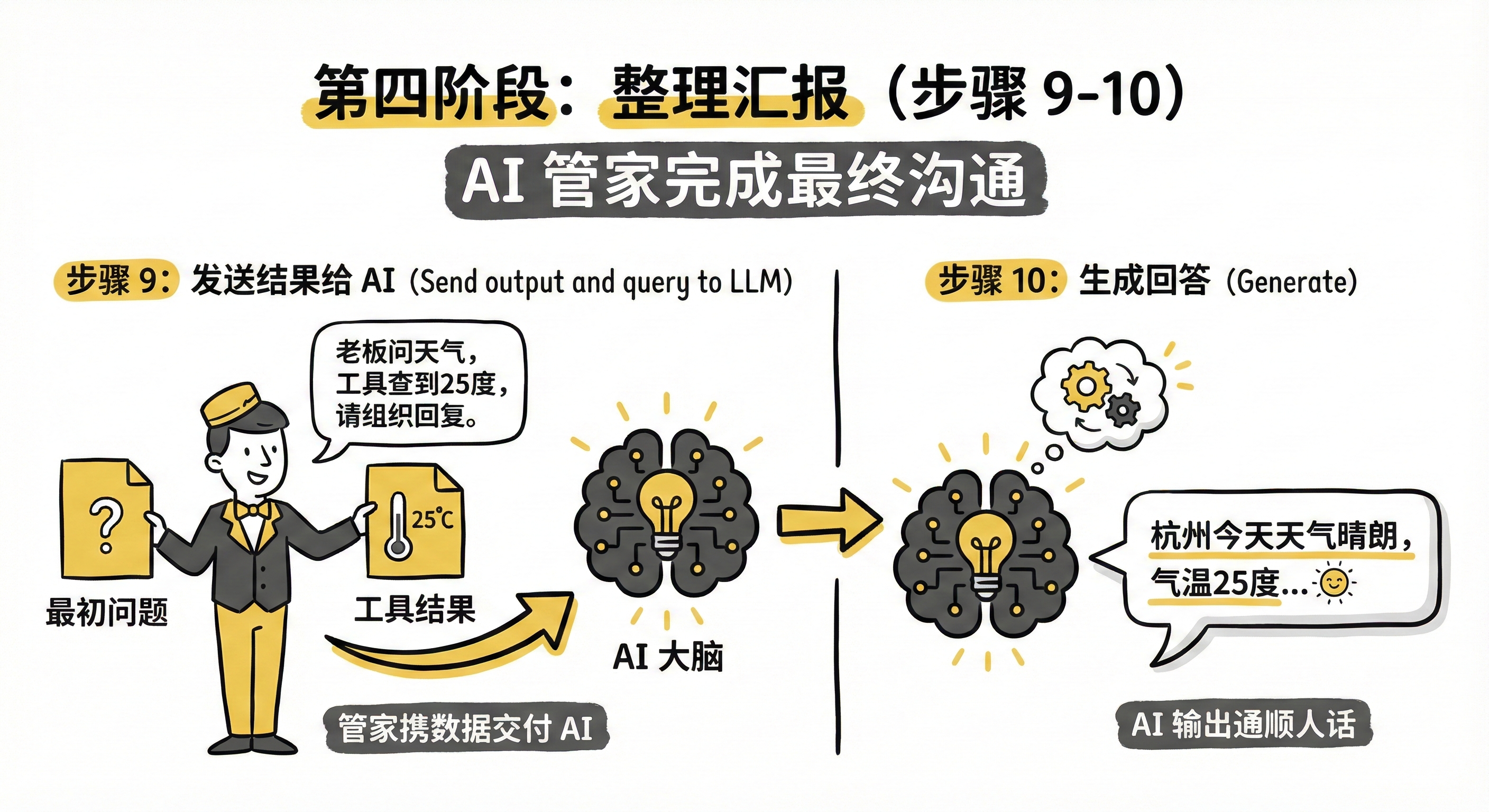 - Send output and query to LLM (发送结果给 AI): 管家拿着你最初的问题和工具查到的结果,一起交给 AI 大脑。就像对 AI 说:“老板问天气的,工具查到了是25度,你组织下语言回复吧。”