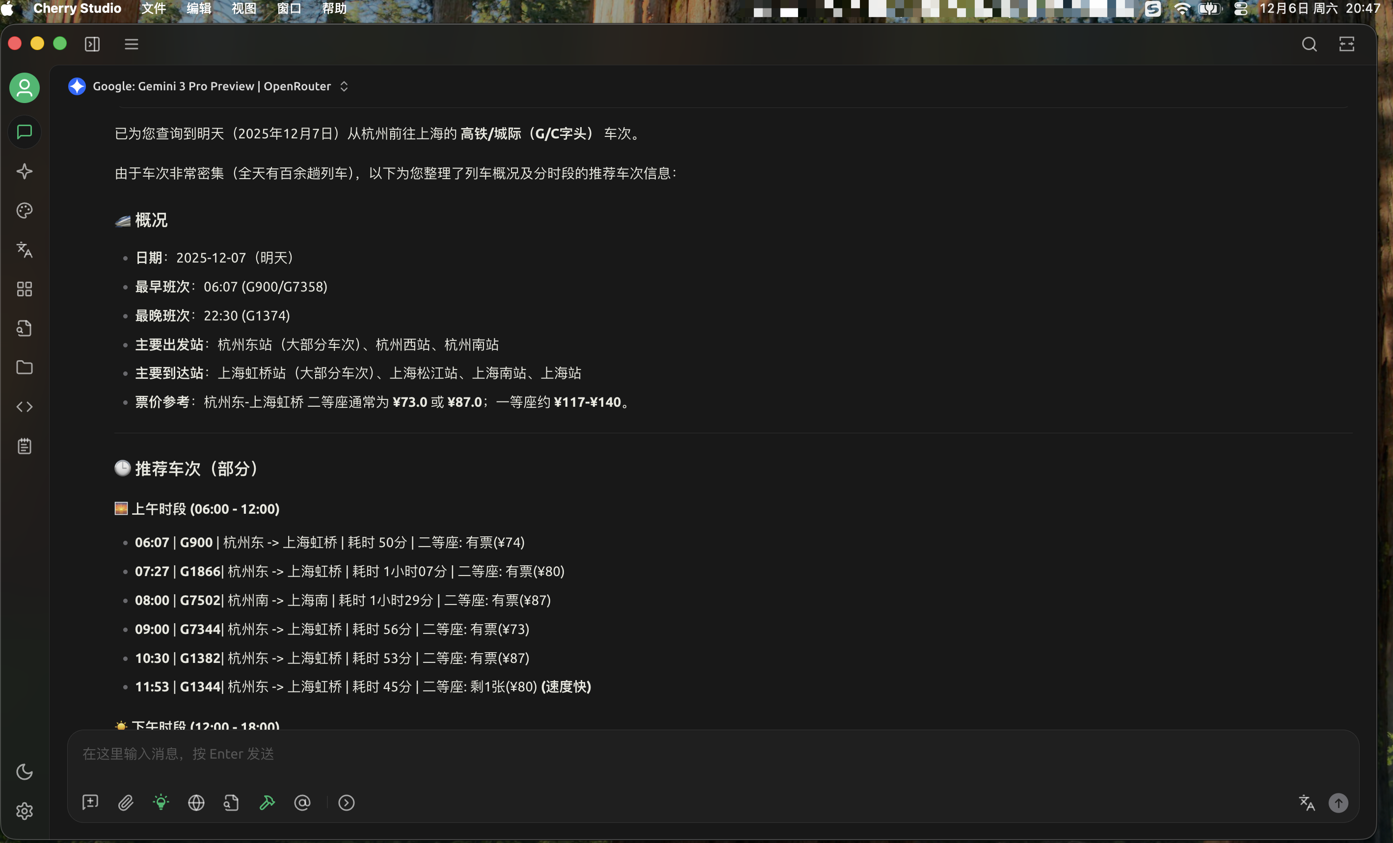 最终给出每个时间段的车次、耗时和是否有票等。