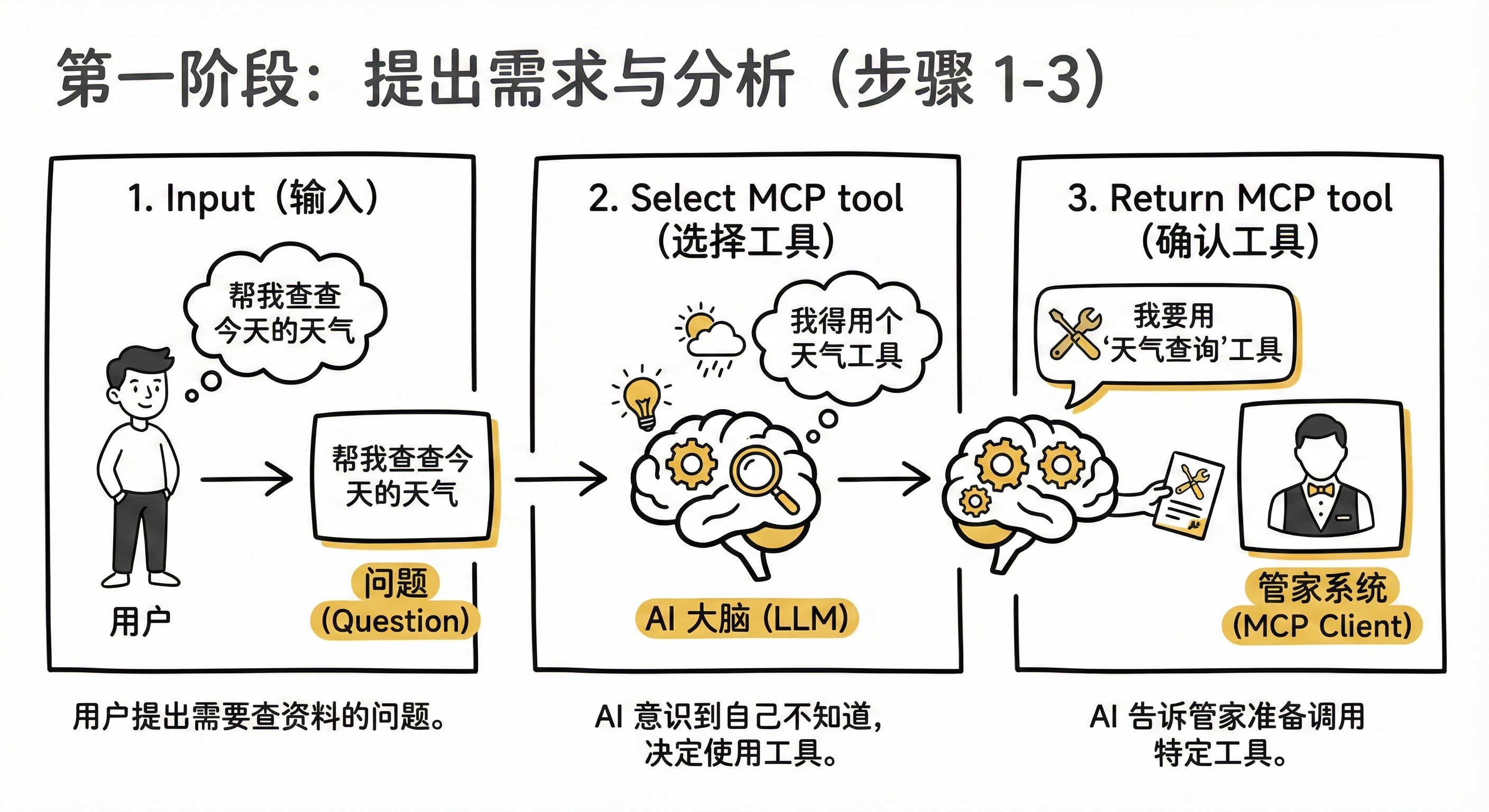 - Return MCP tool (确认工具):AI 告诉管家系统(MCP Client):“我要用‘天气查询’这个工具,准备调用它。”