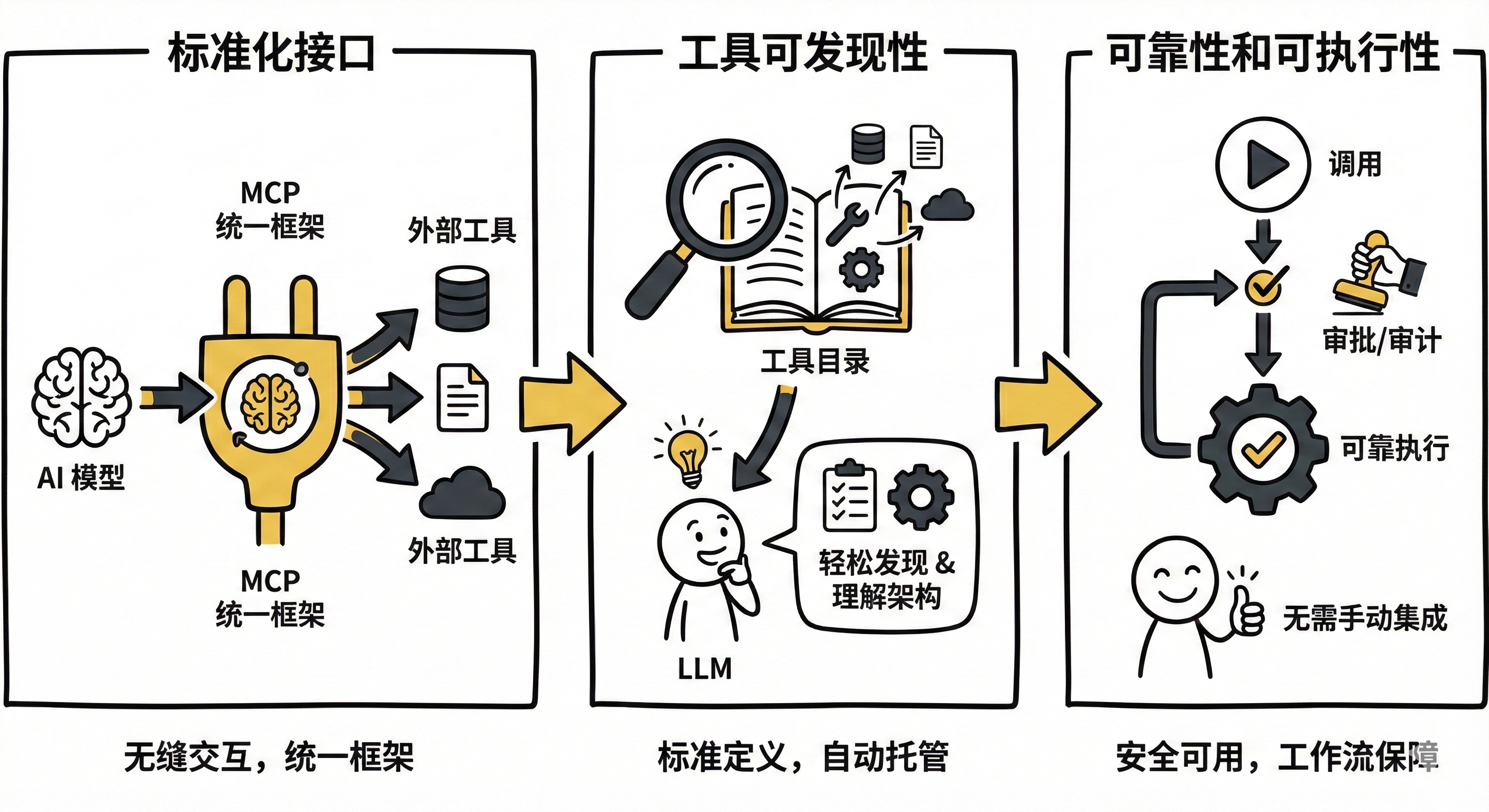 - 可靠性和可执行性: 确保工具可靠可用、可发现、可执行,无需手动定制集成,还能提供调用前的审批和审计工作流