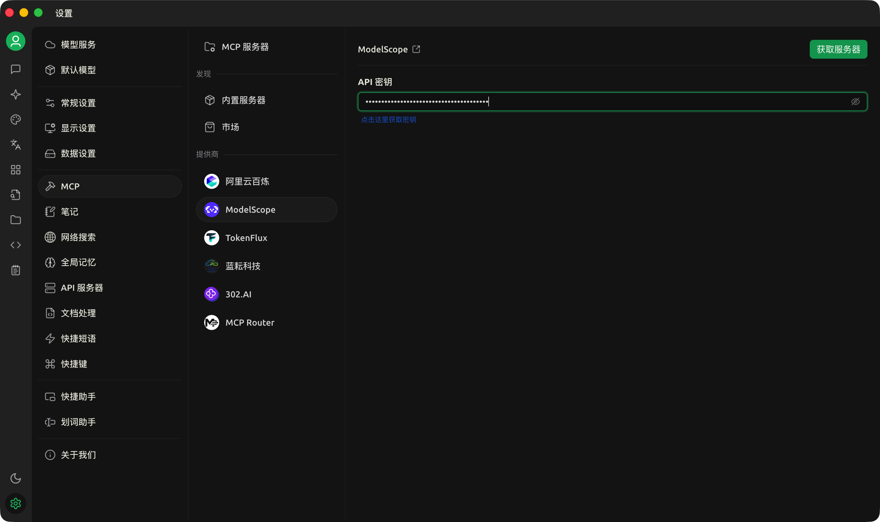 设置 - MCP - ModelScope 获取魔搭的密钥粘贴到这里。