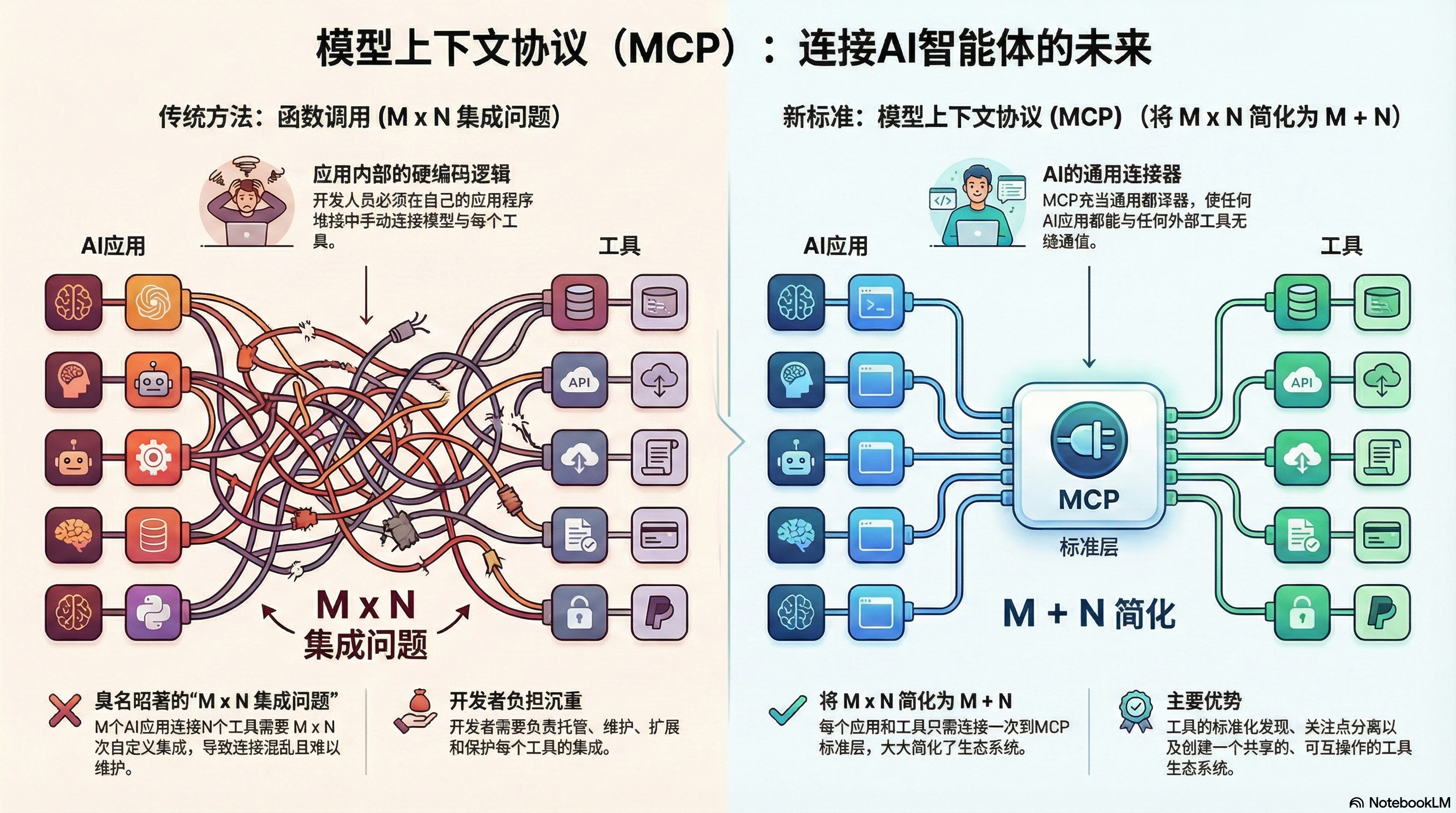 比如说,你有 M 个 AI 应用,N 个工具(数据库、文件系统啥的),那就得写 M × N 个集成模块。每对接一个新工具,都要从头适配一遍,费时费力。