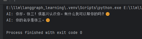 运行这段代码,会发现第二次调用时,AI 能够准确回答"你的名字是张三"。这就是持久化机制在起作用:第二次调用时,checkpointer 自动恢复了第一次对话的历史记录。
