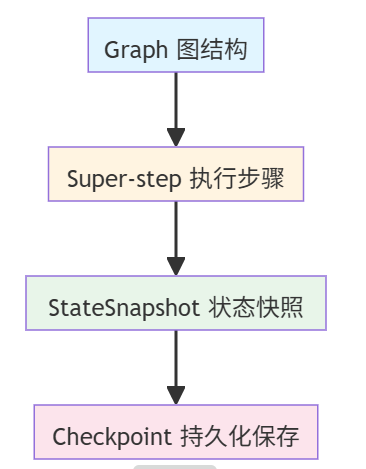 图定义了执行流程,super-step 是执行单位,StateSnapshot 记录状态,checkpoint 将状态持久化保存。
