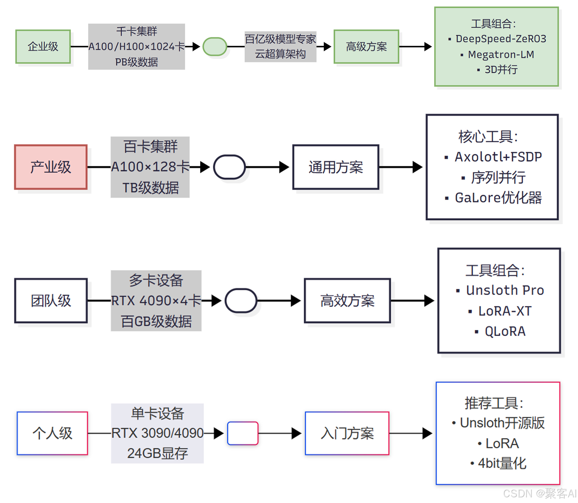 | Unsloth | RTX 3060 | 70B QLoRA | ⚡⚡⚡⚡ | 简单 | 个人开发者 |