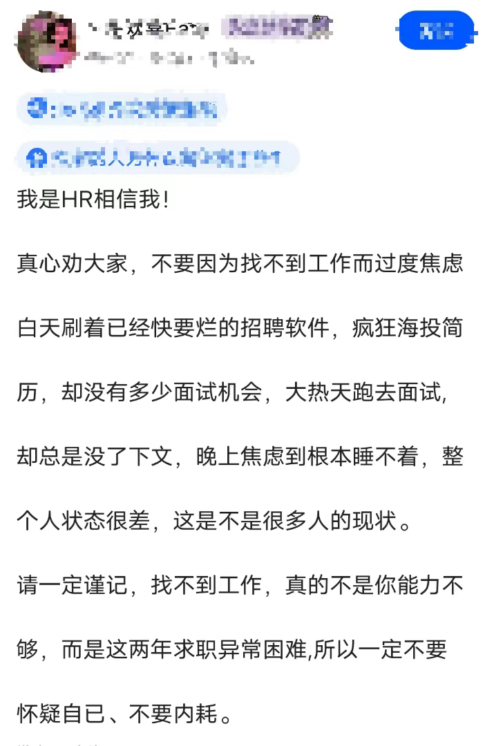 “真心劝大家,不要因为找不到工作而过度焦虑,一定谨记,找不到工作,真不是你能力不够,而是这两年求职异常困难。”