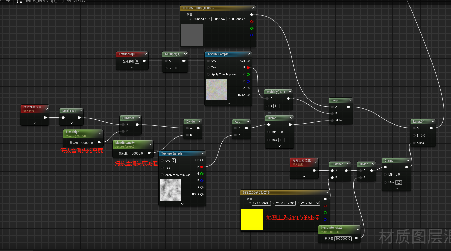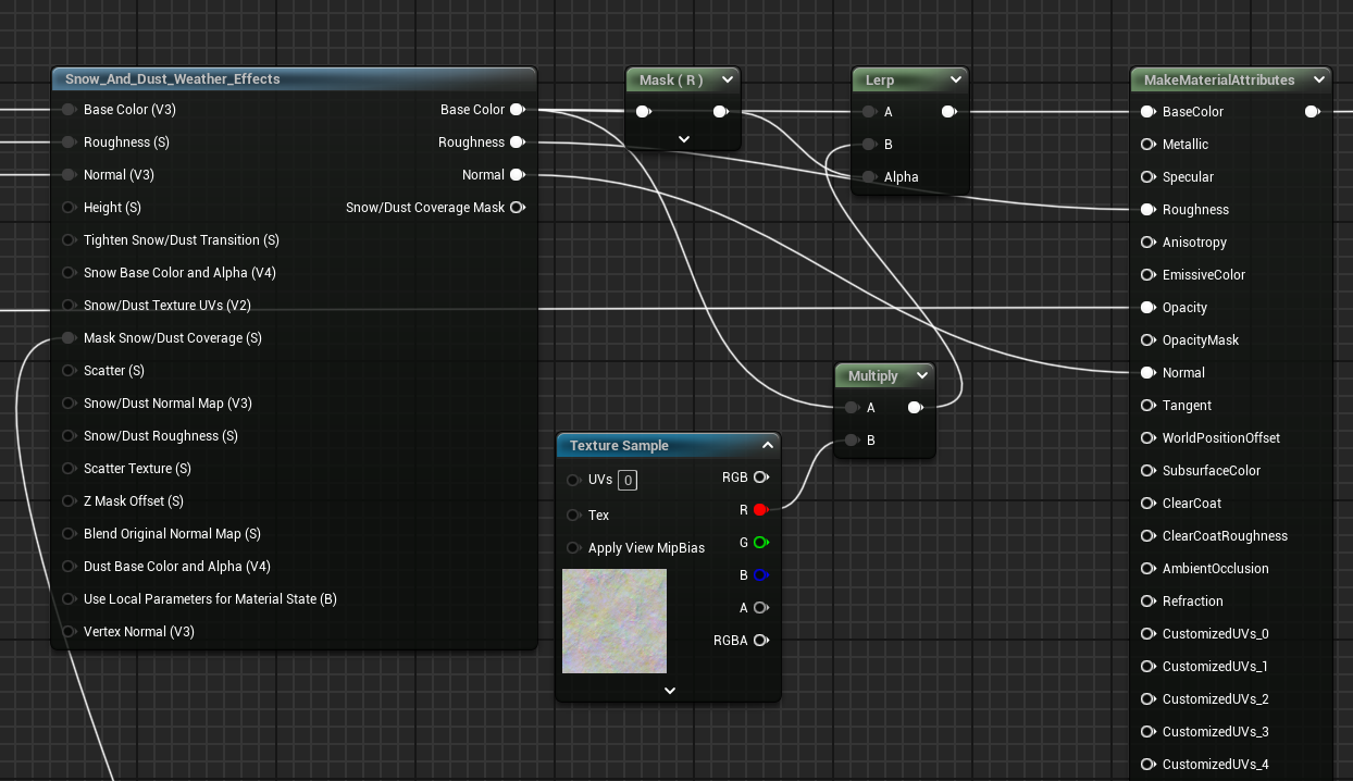 lerp节点连接到Mask Snow/Dust Coverage (S)上。