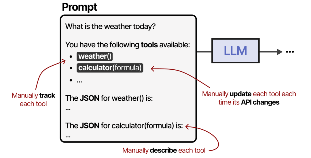工具是智能体框架的重要组成部分,允许 LLM 与世界互动并扩展其能力。然而,当您有许多不同的 API 时,启用工具使用变得麻烦,因为任何工具都需要: