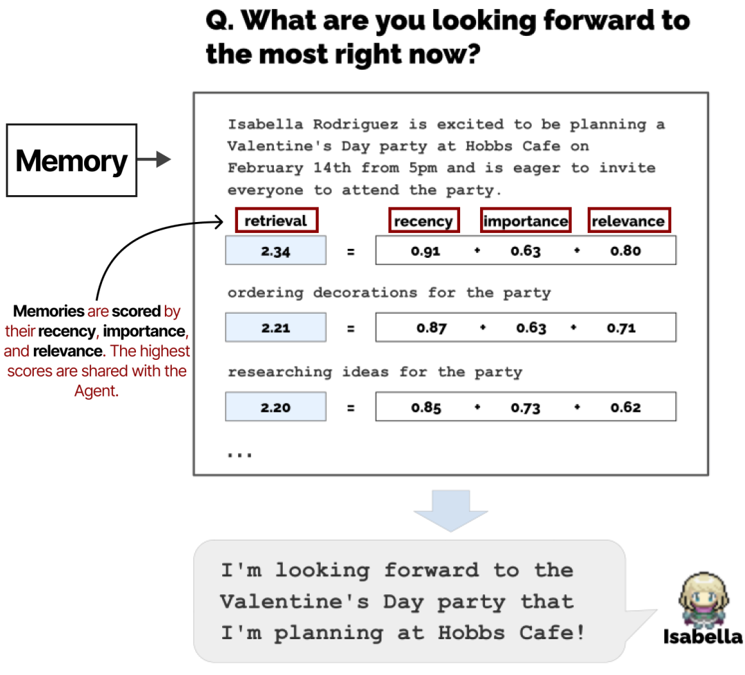对于任何给定的下一步或问题,记忆会被检索并根据其最近性、重要性和相关性进行评分。评分最高的记忆将与智能体共享。