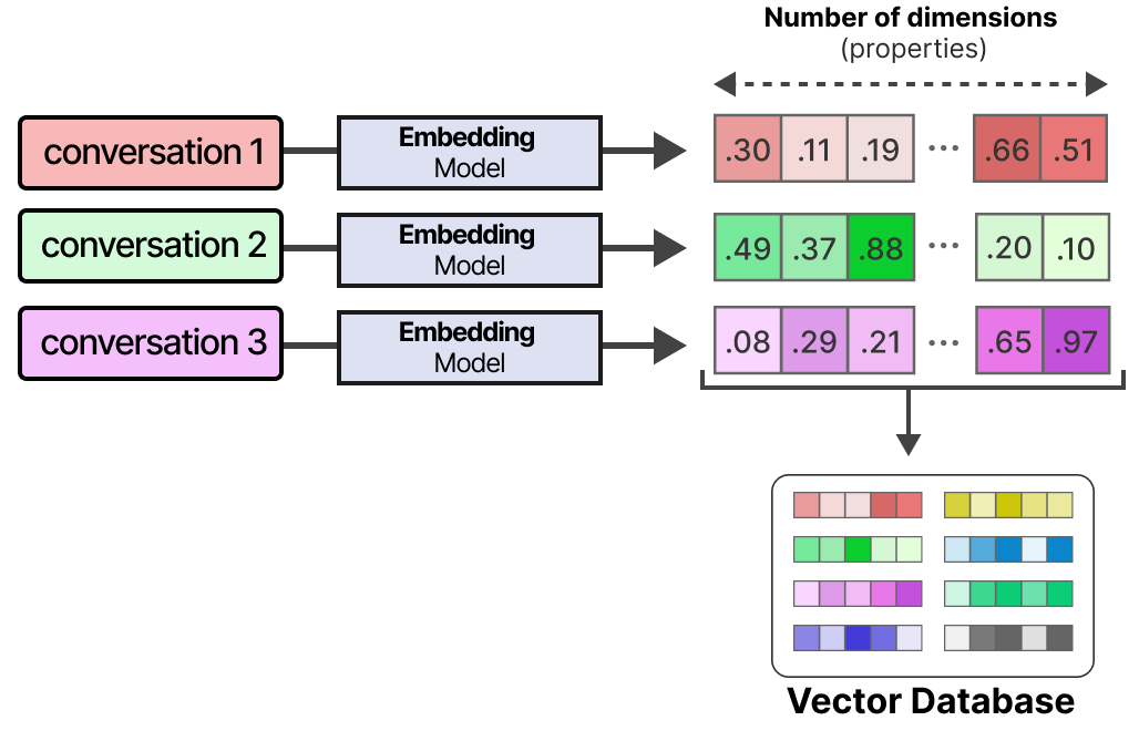 为了构建这样一个数据库,对话首先被嵌入(Embedded)到能够捕捉其含义的数值表示中。