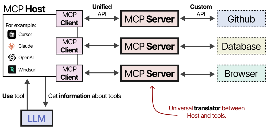这个框架通过连接到任何 LLM 应用程序都可以使用的 MCP 服务器,使创建工具变得更容易。因此,当您创建一个与 Github 互动的 MCP 服务器时,任何支持 MCP 的 LLM 应用程序都可以使用它。