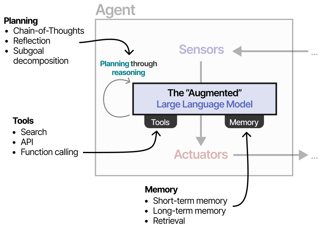 在接下来的部分中,我们将通过 LLM 智能体的三个主要组成部分:记忆、工具和规划,来探讨各种自主行为的方法。