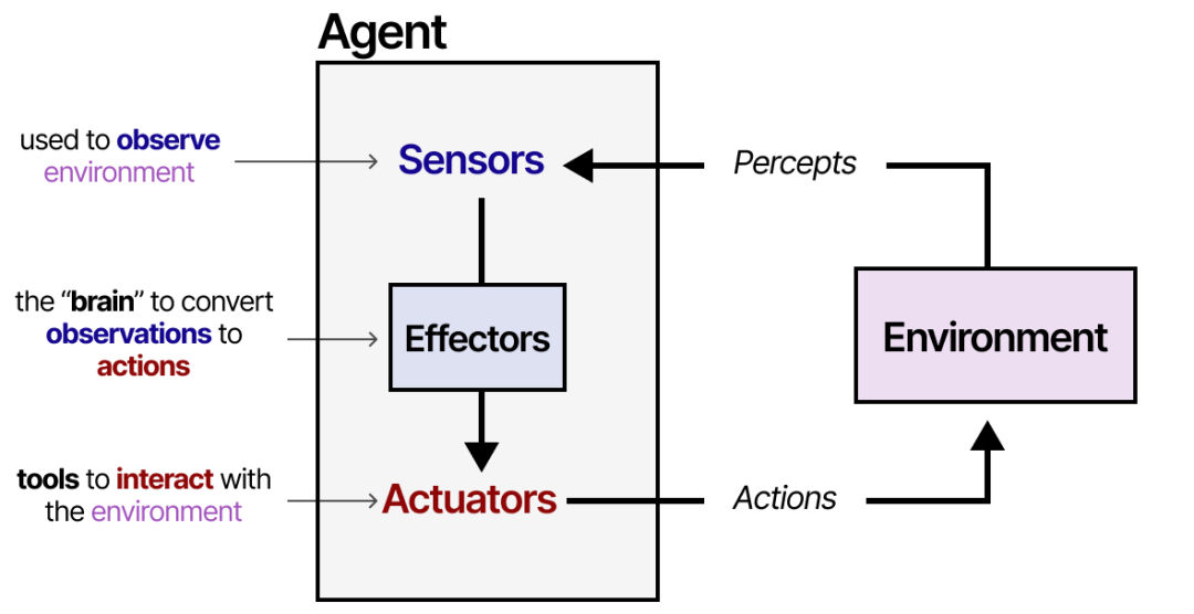 智能体是可以被视为通过传感器感知其环境并通过执行器对环境采取行动的任何事物。