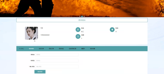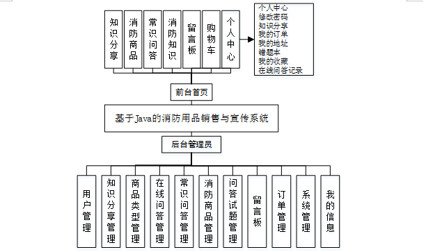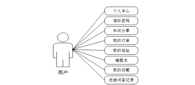 用户功能由个人中心、修改密码、知识分享、我的订单、我的地址、在线问答记录、错题本、我的收藏等功能组成。能对自己的个人信息和密码进行修改,修改前需要先成功登录本系统,还可以对消防商品进行查询,并进行添加到购物车、立即购买、评论或收藏操作;
