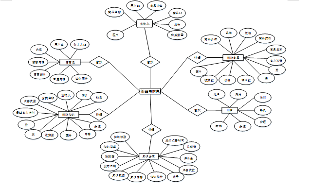 该系统使用免费开源的MySQL数据库,这是一个功能齐全的关系数据库管理系统。系统使用Navicat管理数据库。系统数据库统一使用UTF-8,避免了中文的乱码问题。MYSQL数据库一直以来都是被广泛应用的存在,它能为系统带来简洁的SQL书写以及良好的存储环境,它对分库分区有很大的帮助以减轻单表数据太多带来的压力。根据系统的实体,分析数据库之间的关系,总结出E-R图,而E-R图又以多个实体属性图组成;以下将“用户、消防商品、知识分享、购物车、消防知识、留言板”等作为实体,它们的局部E-R图,如图4-2所示: