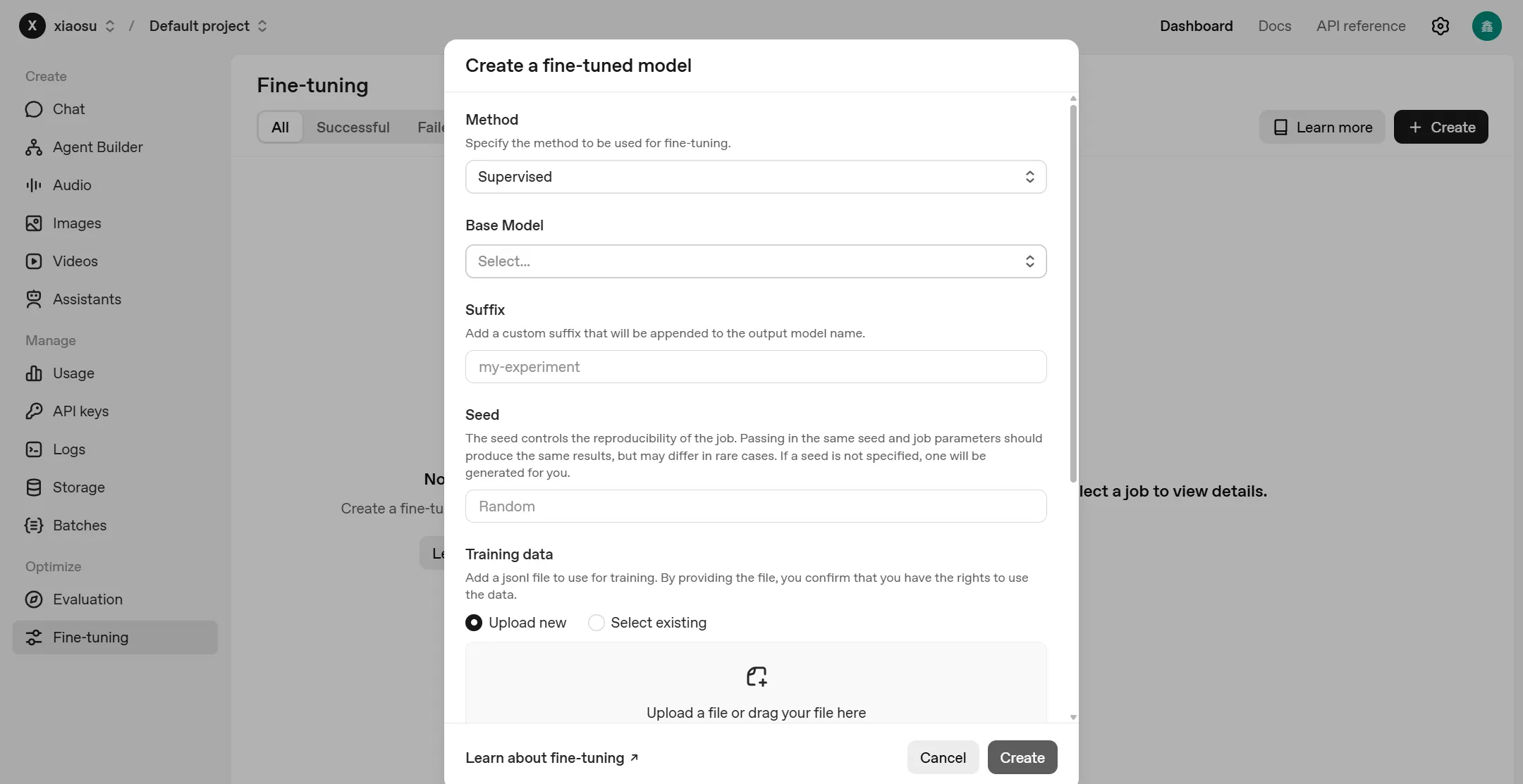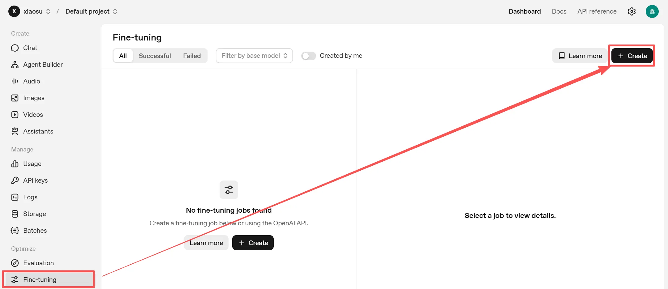 在 OpenAI 平台中,可以在控制面板或通过 API 创建微调模型。这是微调过程的一般步骤: