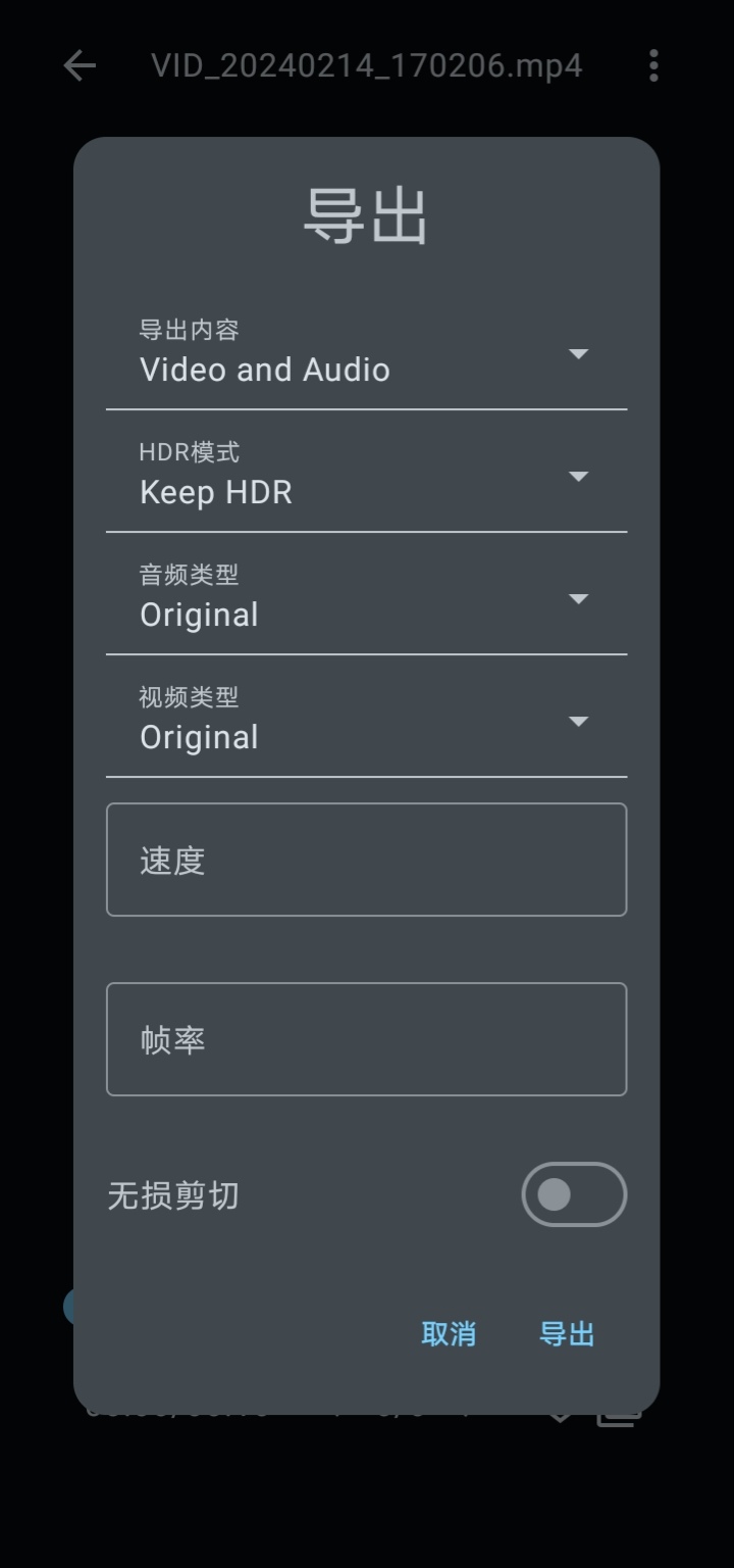 在配置界面可以选择导出方式与音视频的编码格式,点击右下角的导出按钮跳到保存目录的选择界面,选择某个公共目录比如Download,即可将视频片段保存到Download目录。