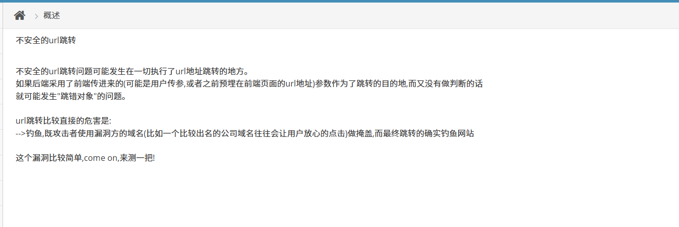 不安全的url跳转问题可能发生在一切执行了url地址跳转的地方。如果后端采用了前端传进来的(可能是用户传参,或者之前预埋在前端页面的url地址)参数作为了跳转的目的地,而又没有做判断的话,就可能发生"跳错对象"的问题。