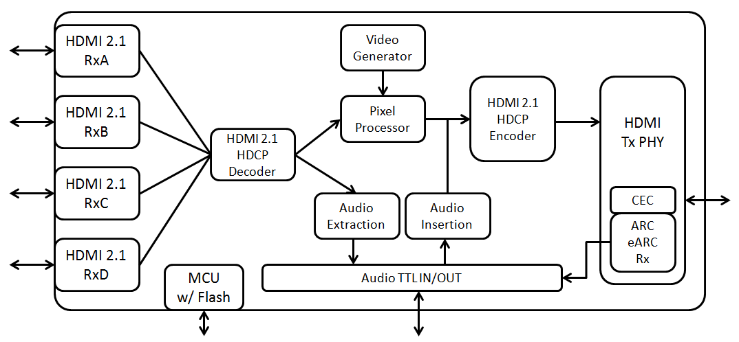 Gscoolink GSV6705 is a high-performance, low-power 4 In to 1 Out HDMI 2.1 repeater. By integrating enhanced microcontroller based on RISC-V, GSV6705 has created a cost-effective solution that provides time-to-market advantages. HDMI Receiver and HDMI Transmitter support up to 48Gbps (FRL, 12G/4Lane). The superior architecture of GSV6705 provides economical smaller footprint solutions using QFN124, targeting applications of Consumer Switch and KVM. HDCP 1.4 and HDCP 2.2/2.3 are implemented in GSV6705 for its all HDMI ports in HDMI 2.0 and FRL mode. Color Space Conversion is supported at HDMI Tx in HDMI 2.0 mode. Flexible implementations of Audio Insertion, Audio Extraction and SPDIF to I2S conversion features are supported in GSV6705. Embedded CEC and eARC Rx engine enable downstream ARC/eARC to I2S and SPDIF audio extraction features. An internal Video Generator can be used to generate any uncompressed video timing defined in HDMI 2.1, such as 8K@60Hz, 8K@30Hz, 4K@120Hz, 480i@60Hz