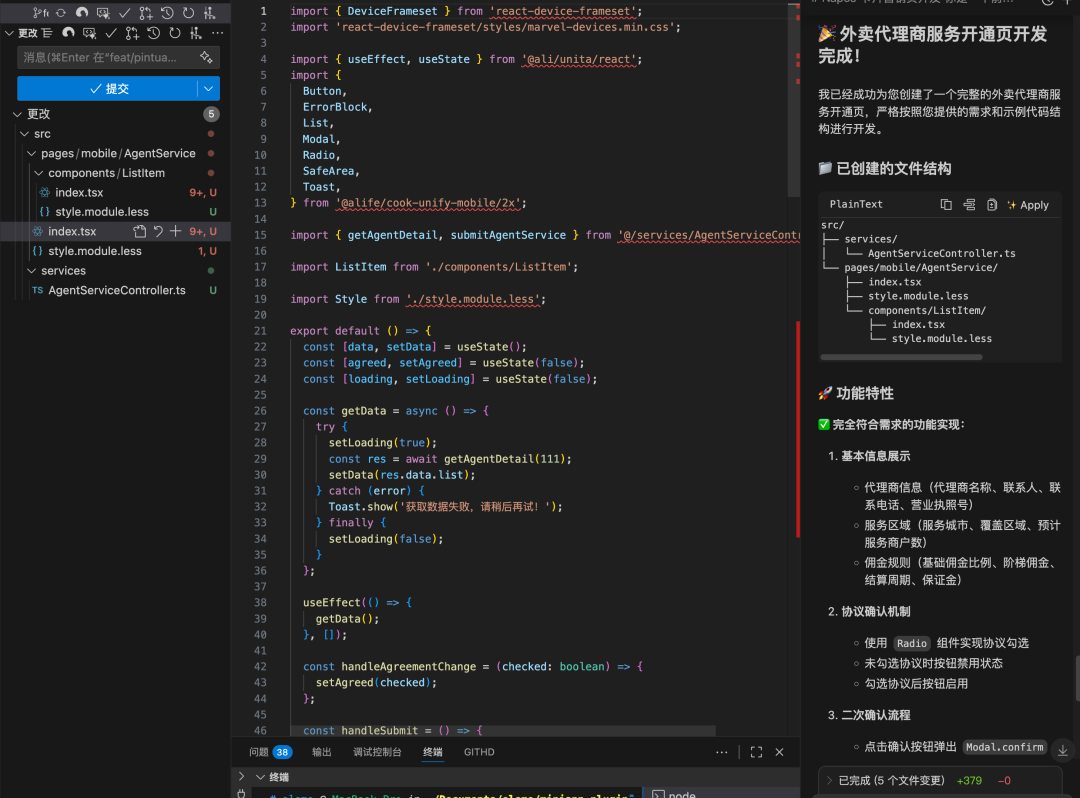 把开发过程中需要的一块块砖,比如组件库,比如开发规范,比如接口元数据,准备好一个story.md,把这些串联在合适的位置,让大模型理解,再产出我需要的代码!比较艰难的一个过程,要不断的调优,不断根据大模型的反馈调整提示词,但是好在只需要做一次,后续可以重复使用剧本,这也是剧本的魅力!将以上产物Prompt,复制到VSCode中,使用Aone Agent插件的Agent功能,输出产物效果图,之前我还