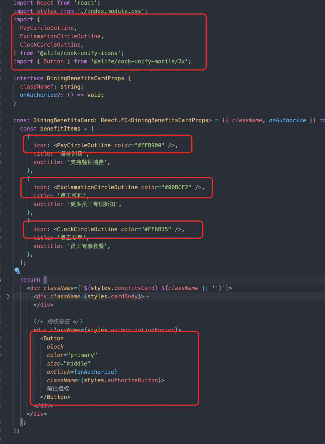 1. 使用组件库组件: ○ Button 组件:使用 @alife/cook-unify-mobile/2x 的 Button 组件实现底部"前往授权"按钮 ○ Icon 组件:使用 ■ PayCircleOutline(金色)- 餐补消费 ■ ExclamationCircleOutline(蓝色)- 员工折扣 ■ ClockCircleOutline(橙色)- 员工专享2. 语义化命名: ○ 组件名:DiningBenefitsCard(用餐优惠卡片) ○ CSS 类名都采用语义化命名,如: ■ .benefitsCard - 优惠卡片 ■ .cardTitle - 卡片标题 ■ .benefitsGrid - 优惠项目网格 ■ .benefitItem - 优惠项目 ■ .authorizeButton - 授权按钮3. 设计还原: ○ 完整还原了 imgcook 解析的布局结构和尺寸 ○ 保持了原始的颜色、字体、间距等设计细节 ○ 使用图标替换了原始的图片资源,更加语义化4. 技术实现: ○ 使用 TypeScript 和 React ○ 采用 CSS Modules 进行样式隔离 ○ 支持点击回调函数 onAuthorize ○ 支持通过 props 传入额外的 classNam