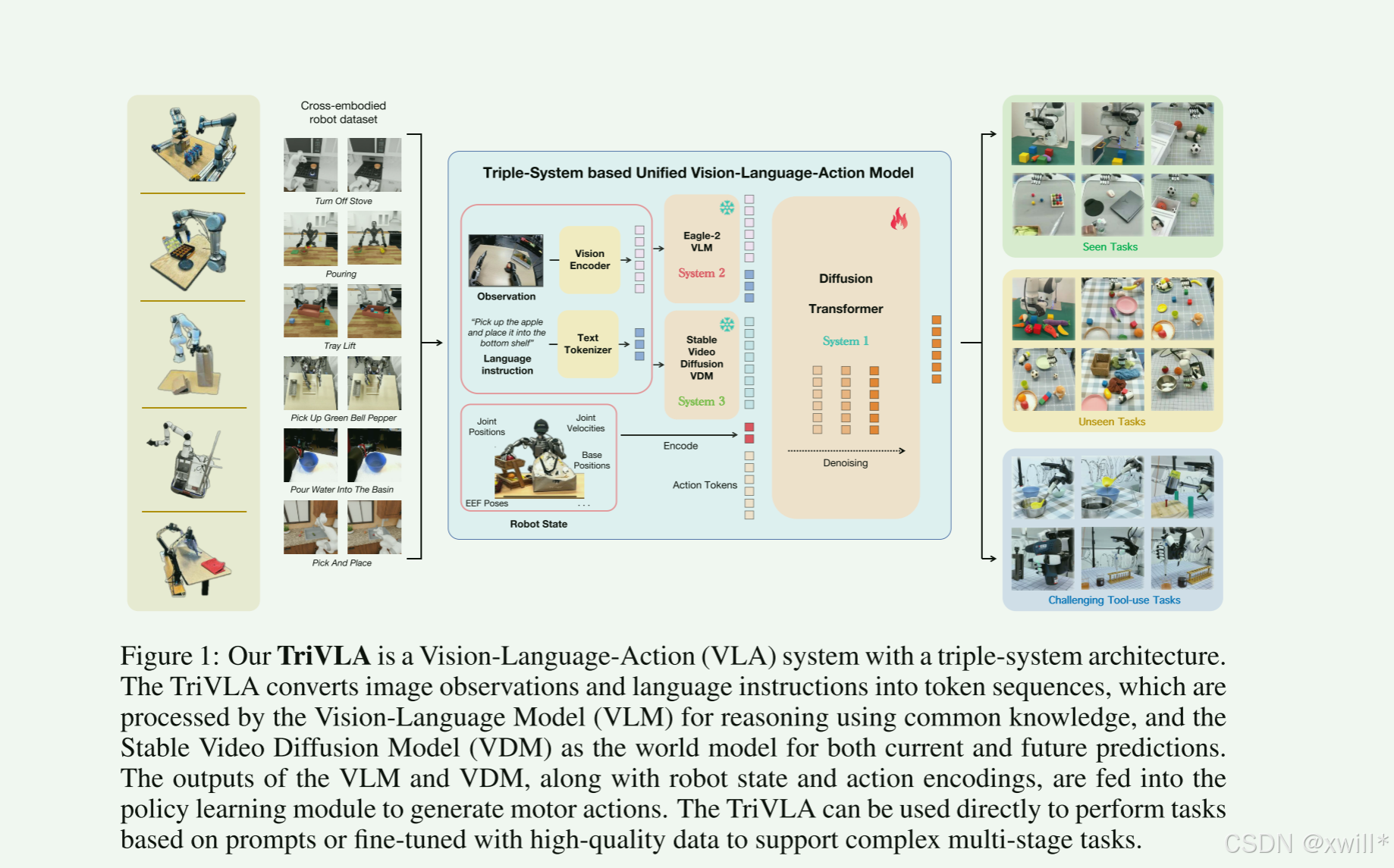 而现阶段的VDMs(视频扩散模型,Video Diffusion Models)的是整个视频序列,并且能够预测未来帧,这意味着 VDM 天生就理解物理世界是如何随时间变化的。于是作者提出了 TriVLA。这不仅仅是加一个模块,而是引入了一个 “World Model(世界模型)” 的概念——通过预测未来视频,来模拟物理世界。