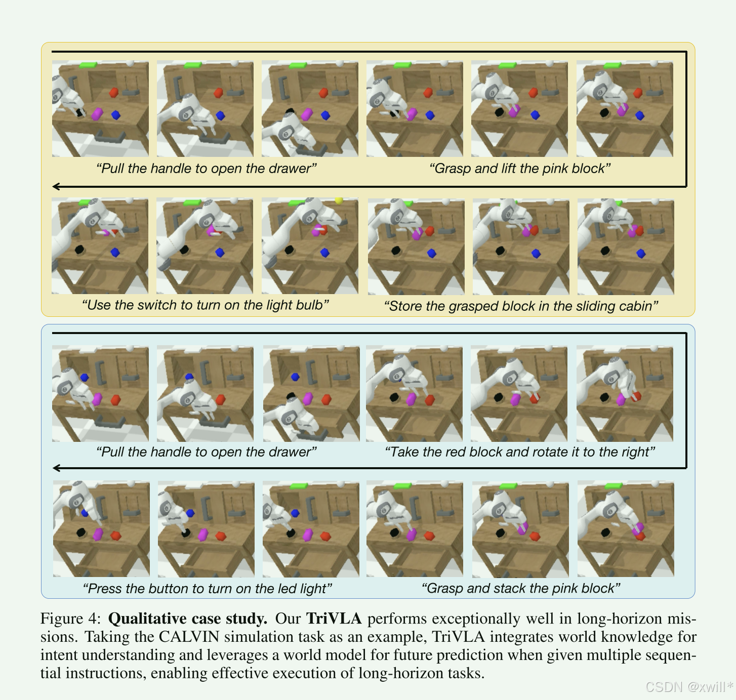 TriVLA 展示了一种新颖的三系统架构,有效地将视觉-语言理解与动力学感知结合起来,增强了机器人捕捉静态信息和未来动态信息的能力。这种整合为机器人操作实现了更流畅和更具泛化性的控制策略。实验结果表明,TriVLA 在标准仿真基准和具有挑战性的现实世界任务上超越了最先进的模仿学习基线,突显了其在通用机器人控制中的广泛应用潜力。那么为什么是三系统架构呢?因为,不仅仅要看得懂,还要有做预判的能力。只有