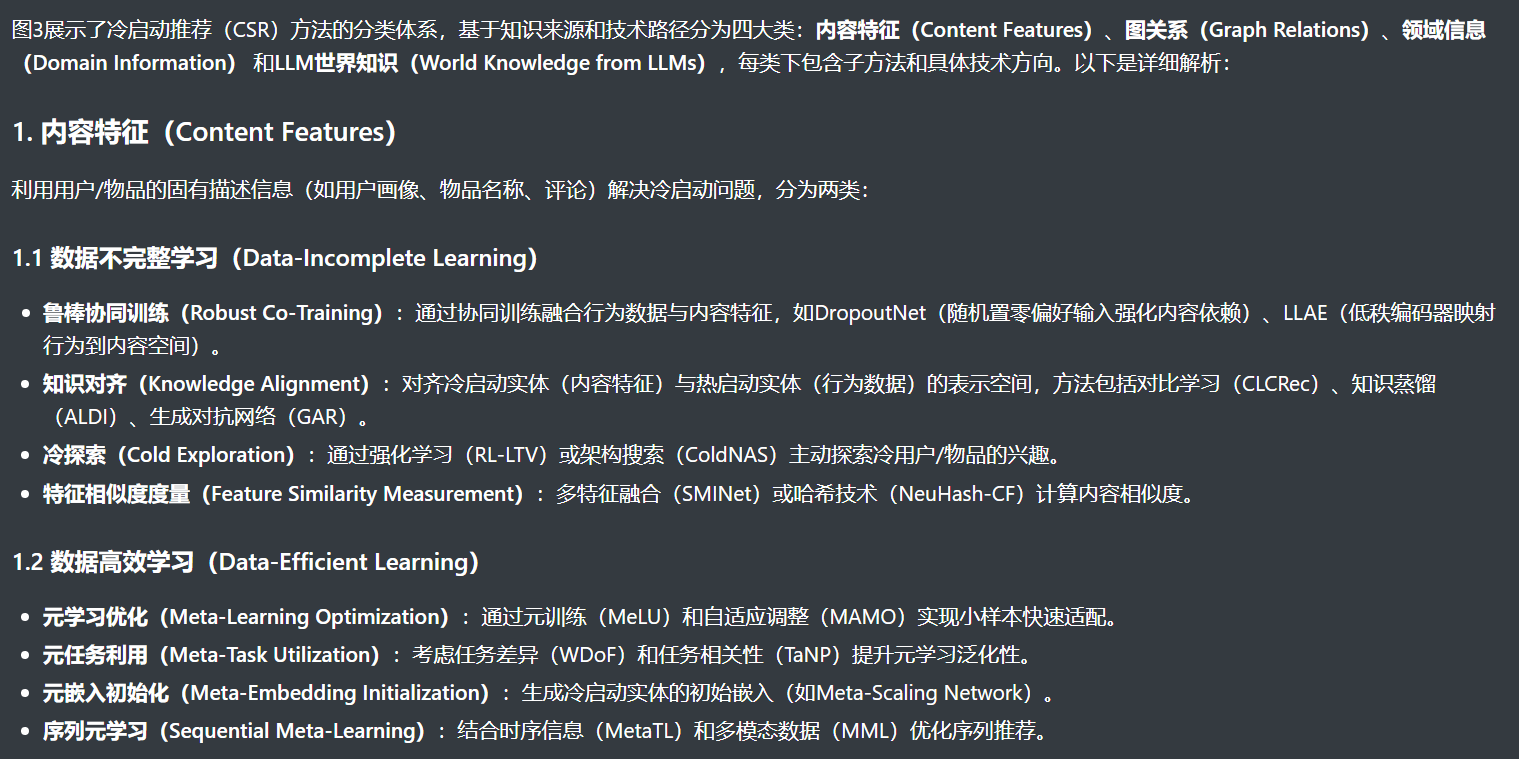 - 例子:ColdLLM(用 LLM 模拟器生成用户与冷物品的虚拟交互,将冷物品 “暖化”);CSRec(用 LLM 提取常识知识构建知识图,融合现有元数据知识图)。